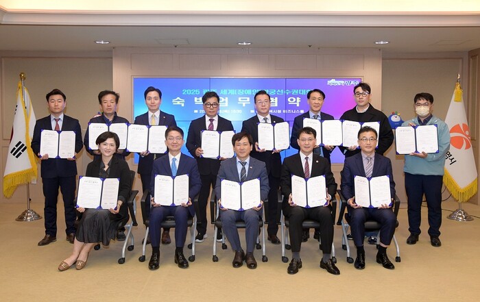 [광주=정찬남 기자] 광주광역시(시장 강기정)는 16일 오후 시청 비즈니스룸에서 홀리데이인광주호텔, 라마다플라자광주호텔, 센트럴광주호텔&레지던스 등 광주지역 14개 호텔과 ‘2025 광주 세계(장애인)양궁선수권 대회의 성공 개최를 위한 숙박 업무협약’을 체결했다.