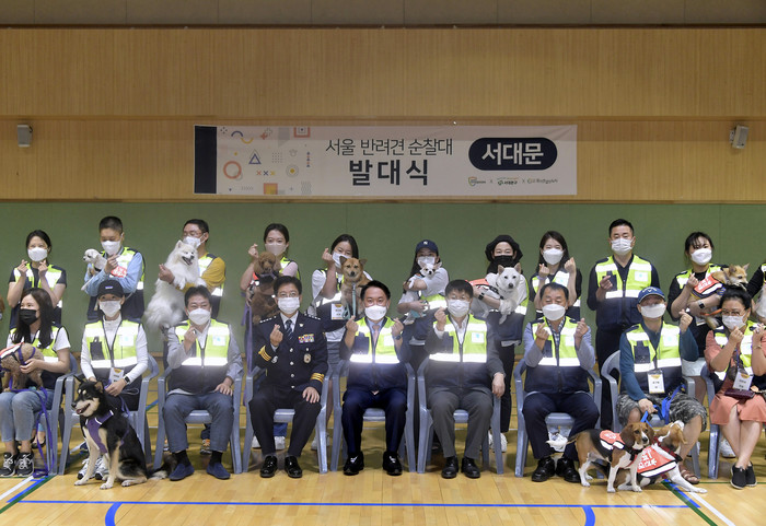 서울 서대문구는 최근 지역 안전과 반려동물 인식 개선을 위해 활동할 ‘서울 반려견 순찰대’ 발대식을 개최했다. 사진은 발대식에 참석한 이성헌 구청장(앞줄 가운데)이 참여 견주들과 기념촬영을 하고 있는 모습. (사진제공=서대문구청)