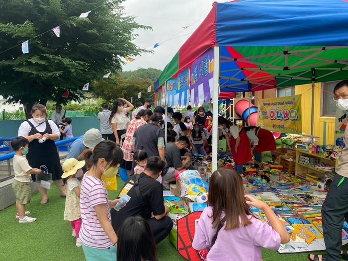 경기 포천시 한솔어린이집이 최근 일동면의 어려운 이웃을 위해 ‘아나바다·시장놀이’를 통해 얻은 판매 수익금 40만8500원을 사회복지공동모금회를 통해 기탁했다. 사진은 최근 ‘아나바다·시장놀이’에서 옷·책·장난감 등을 지원 받아 어른들과 아이들이 함께 물건을 판매하고 있는 모습. (사진제공=포천시청)