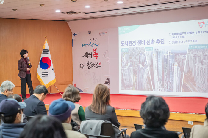 | ▲ 이수희 구청장이 지난 1월 구정보고회에서 명일동 등 도시환경 정비 신속 추진에 대한 설명을 하고 있다. (사진=강동구청 제공) |