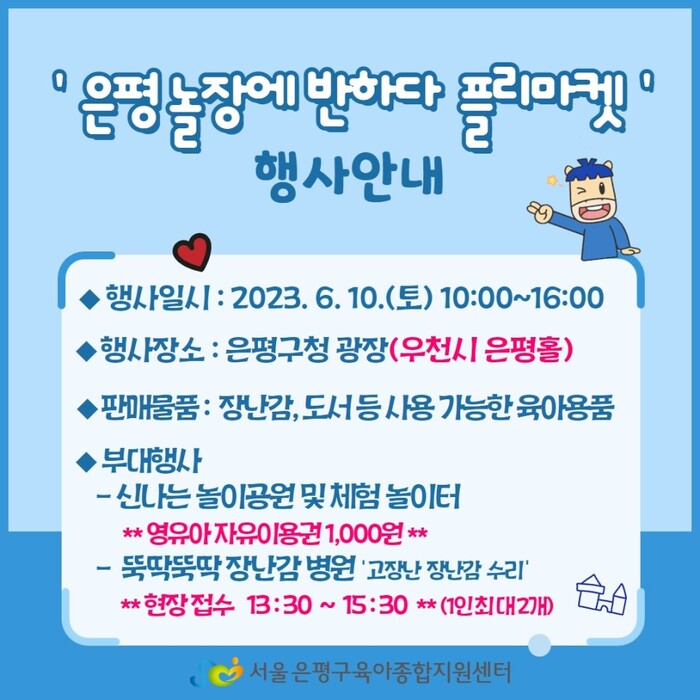 쓸만한 장난감, 도서 등 영유아 물품을 저렴하게 구매할 수 있는 벼룩시장이다. 부대행사로 놀이공원과 장난감병원도 운영한다. 영유아를 둔 가정이면 구청 광장을 찾는 누구나 참여할 수 있다.