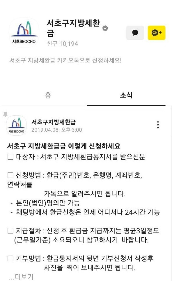 | ▲ 서초구 지방세환급 카카오톡 채널 화면. (사진제공=서초구청) |