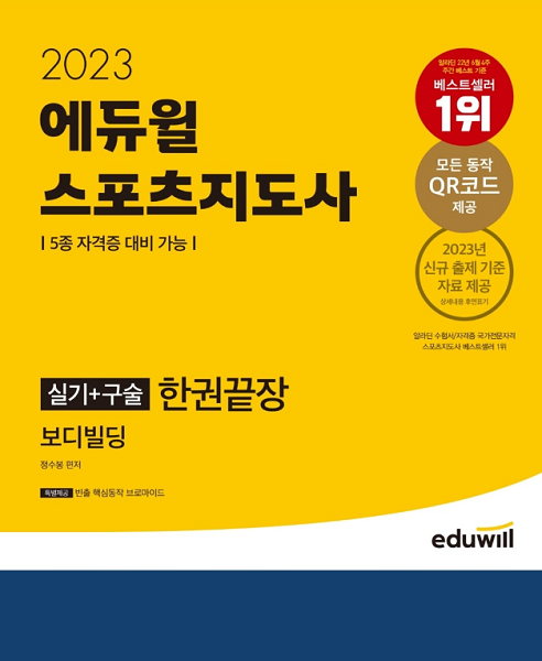 ‘2023 에듀윌 스포츠지도사 실기+구술 한권끝장’은 스포츠지도사 실기 시험 전 알아야 할 암기 기초이론을 컬러 이미지 자료 및 해설과 함께 담았고, 실기 평가 영역에 출제되는 동작 설명을 페이지내에 게재된 QR코드를 통해 확인할 수 있도록 준비했다. 더불어, NG사진으로 수험생의 실수를 최소화하게끔 돕고, 시험장에서의 해법 공간을 통해 실기 시험의 완성도를 향상할 수 있게 마련했다.