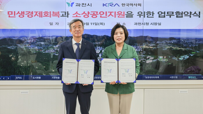 경기 과천시가 최근 신계용 시장과 한국마사회 정기환 회장이 참석한 가운데 한국마사회와 ‘민생경제회복과 소상공인 지원을 위한 업무 협약’을 체결했다. 사진은 신 시장(오른쪽)이 정 회장(왼쪽)과 협약서를 들고 기념 촬영을 하는 모습. (사진=과천시청 제공)