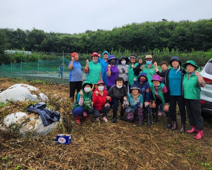경기 포천시 내촌면 남녀 새마을지도자협의회는 최근 내촌면 내4리 인근 밭 990㎡에 지역내 어려운 이웃에게 전달할 ‘사랑의 배추심기’를 진행했다. 사진은 이날 참여한 봉사자들이 기념촬영을 하는 모습. (사진제공=포천시청)