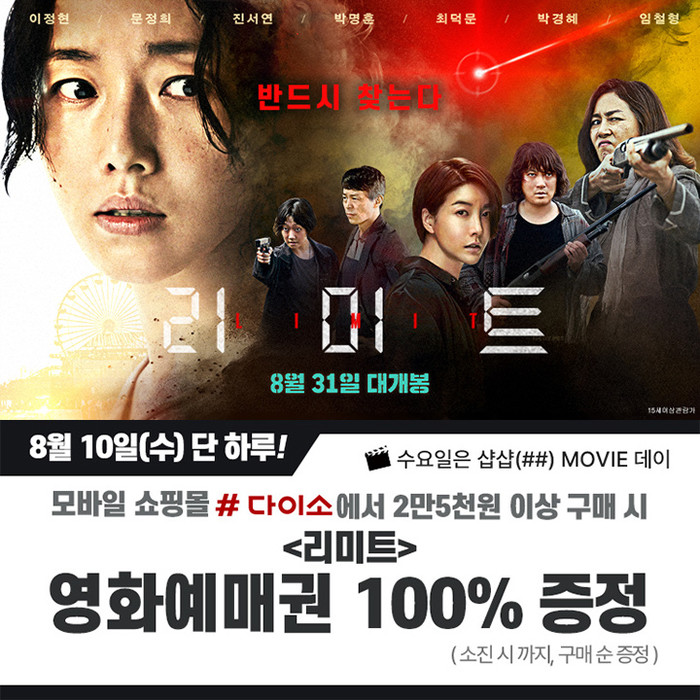 이번 이벤트는 샵다이소에서만 진행하며, 오는 10일 단 하루동안 샵다이소에서 2만 5000원 이상 구매 시 '리미트' 영화예매권(1인 2매)을 소진시까지 100% 증정한다. 자세한 사항은 샵다이소 앱에서 확인할 수 있다.