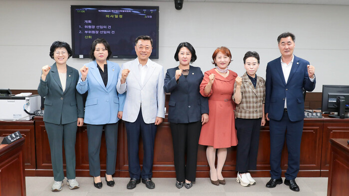 | ▲ 제290회 안산시의회 제1차 정례회 예산결산특별위원회가 3일 위원 선임과 위원장 및 부위원장 선출을 마쳤다. 사진 왼쪽부터 박은경 김진숙 김재국 황은화 현옥순 이지화 유재수 위원의 모습 /사진제공=안산시의회 |