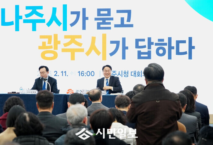 | ▲ 강기정 광주광역시장이 11일 오전 나주시청 대회의실에서 열린 '광주전남 통합 나주시 상생토크'에 참석해 통합의 필요성과 나주시 발전 방안에 대해 소통하고 있다. /광주광역시 제공 |