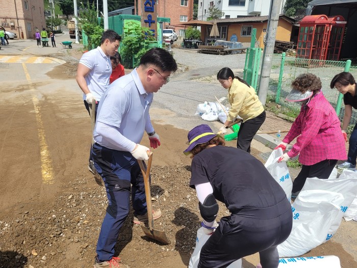 이 자리에 성남시의회 더불어민주당 조정식 대표의원도 함께 수해복구 현장에 일손을 도왔다.