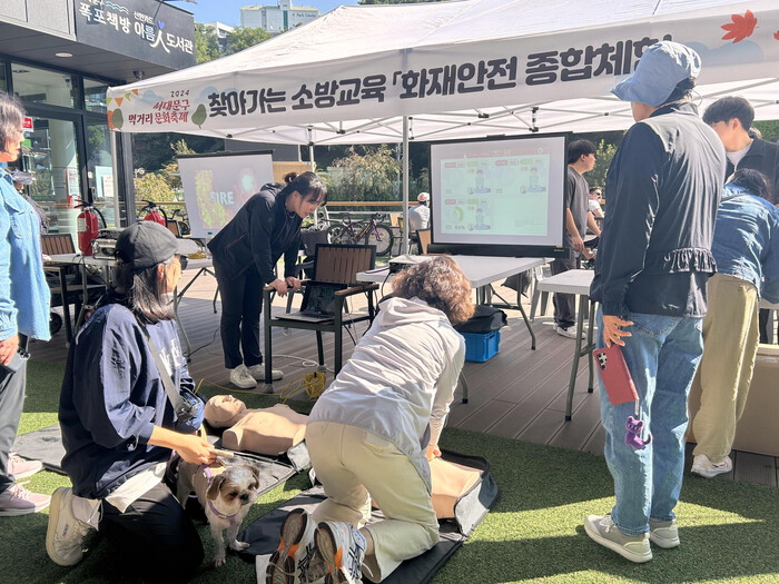 | ▲ ‘2024 서대문구 먹거리 문화축제’ 때 운영된 재난안전 체험 부스에서 시민들이 심폐소생술 교육을 받고 있다.(사진=서대문구청 제공) |