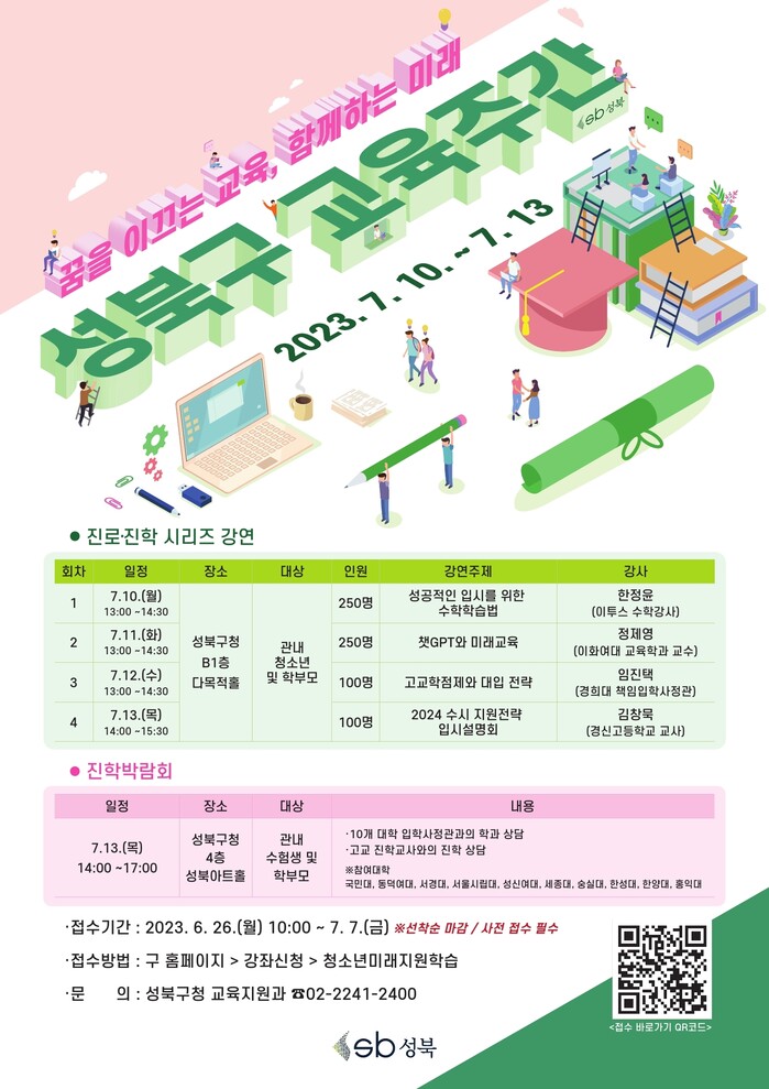 구 관계자는 "성북구 특별 교육주간은 수요자 맞춤형 교육서비스를 제공하는 '성북형 교육도시' 구축을 위한 노력 중 하나"라고 설명했다.