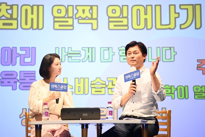 조용익 경기 부천시장은 최근 대학생 110명과 만나 토크 콘서트 ‘영톡스클럽’을 통해 소통했다. 이번 토크콘서트에서는 조 시장이 추천하는 세 곡의 음악에 각각 성장·의미·시작이라는 주제를 담아 솔직한 이야기가 이어졌고 대학생들의 고민에 대한 대화를 나눴다. 사진은 조 시장(오른쪽)이 대학생과의 토크콘서트에서 청년의 고민에 답하고 있는 모습.(사진제공=부천시청)