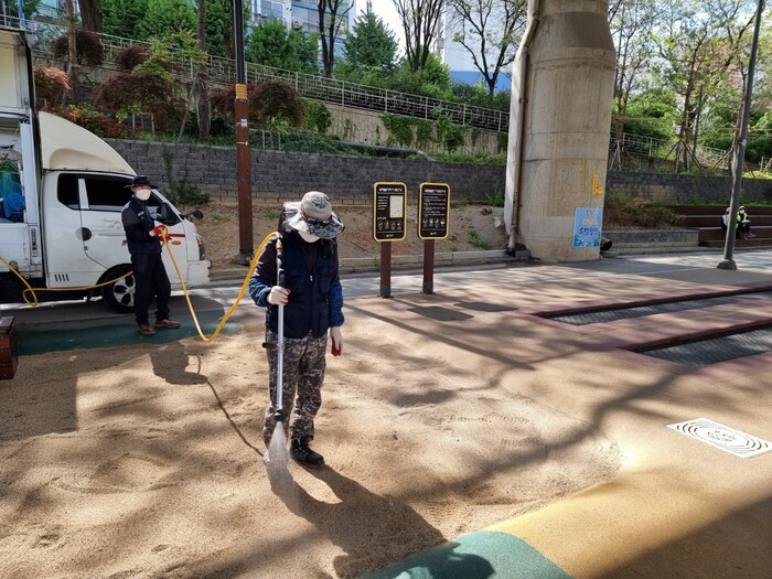 | ▲ 모래놀이터 소독 작업을 하고 있는 모습 (사진=성동구청 제공) |