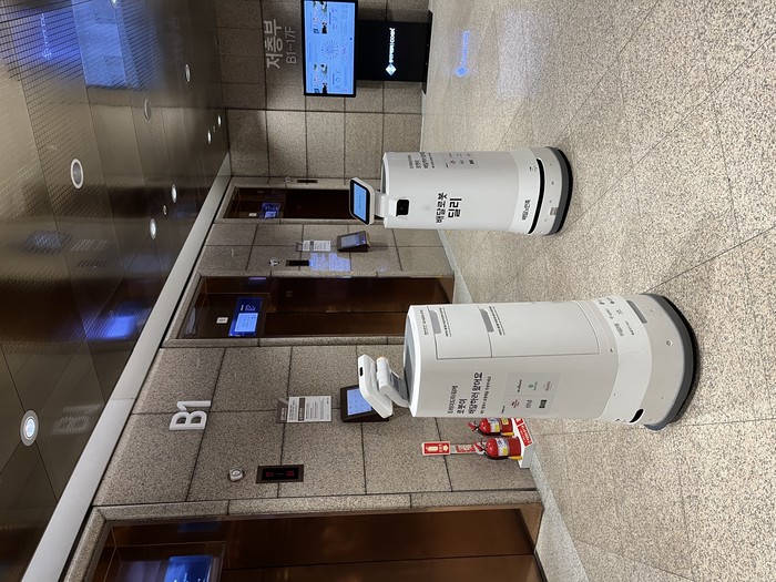 | ▲ 엘리베이터를 기다리는 배달로봇들. (사진제공=강남구청) |