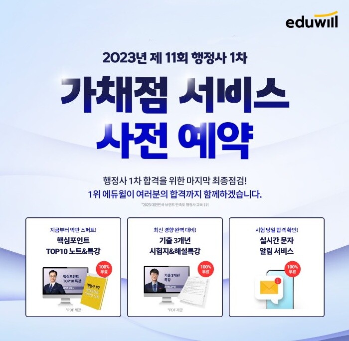 행정사 1차 합격을 위한 마지막 최종 점검을 돕고자 가채점 서비스 사전 예약자 전원에게 핵심포인트 탑10 노트 및 특강과 기출 3개년 시험지 및 해설 특강을 증정한다. 아울러, 시험 당일 가채점 서비스 오픈 시, 실시간 알림 문자를 발송해 정답 확인 및 가채점 후 합격 가능성을 점쳐 볼 수 있다.