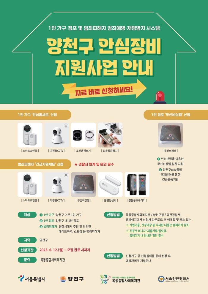 [시민일보 = 이대우 기자] 서울 양천구(구청장 이기재)가 범죄에 취약한 1인 가구를 대상으로 안전한 주거환경 조성을 위한 ‘1인가구 안심장비 지원사업’ 대상자를 12일부터 모집한다.