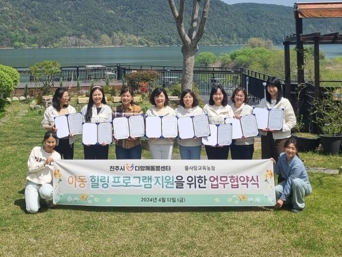 진주시 다함께돌봄센터 7개소는 12일 대평면에서 물사랑 교육농장(대표 윤계자)과 이용 아이들에게 다양한 힐링 프로그램 지원을 위한 업무 협약을 체결했다.