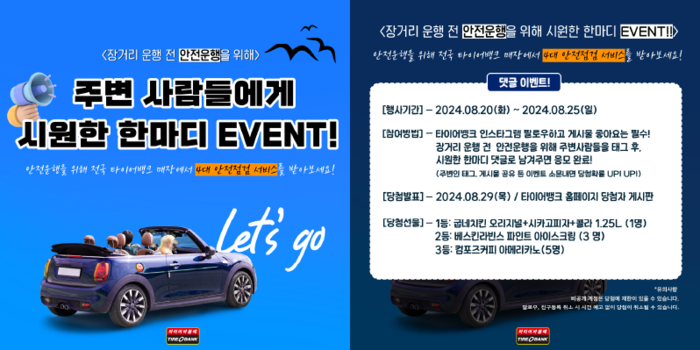 타이어뱅크(회장 김정규)가 공식 SNS를 통해 여름철 안전운행을 응원하는 '안전운행을 위한 시원한 응원 한마디'이벤트를 진행한다.