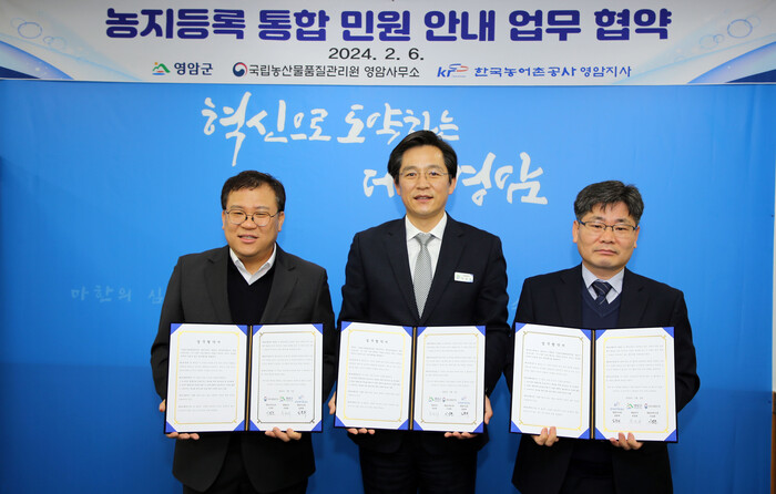 [영암=정찬남 기자] 전남 영암군이 6일 군청에서 국립농산물품질관리원 영암사무소, 한국농어촌공사 영암지사와 ‘농지등록 통합민원 안내 업무협약’을 체결했다.
