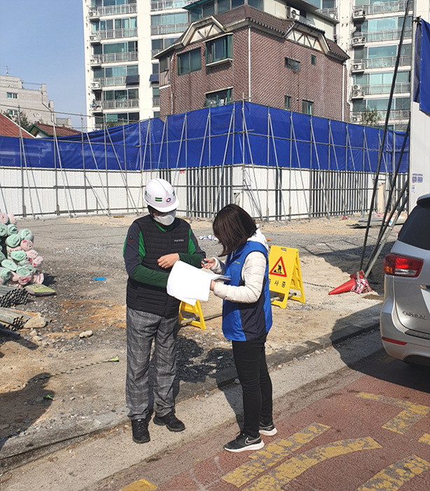 | ▲ 공사장에서 소음이 심하게 발생한다는 민원 신고를 받은 구 환경정책과 관계자가 공사 현장을 방문해 현장지도하고 있다. (사진제공=도봉구청) |
