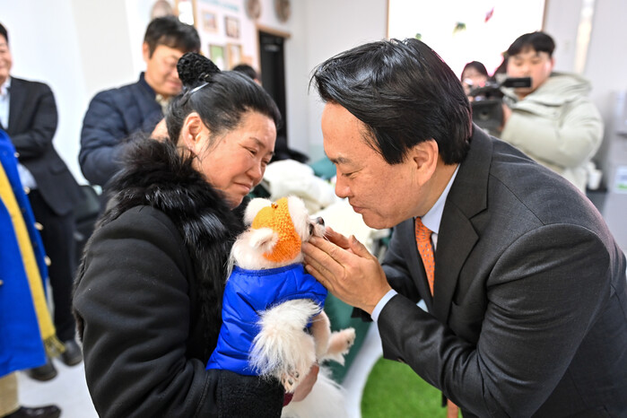 | ▲ 이달 7일 서대문 내품애(愛)센터에서 열린 ‘마침내 내품애(愛)! 입양식’에서 이성헌 서대문구청장(오른쪽)이 힘든 수술과 재활을 견딘 후 새 주인에게 입양되는 강아지와 눈을 마주치며 가까이 살펴보고 있다. (사진=서대문구청 제공) |