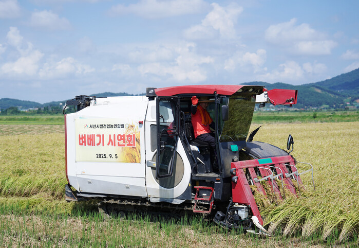 5일 충남 서산시 부석면 지산리 1778번지 일원에서 벼 베기 시연회가 개최됐다. 이날 시연회에는 이완섭 서산시장을 비롯해 시연회를 주관한 한국쌀전업농 서산시연합회 김정식 회장과 회원, 지역 주민 등 100여명이 참석했다. 사진은 이 시장이 콤바인을 활용해 지난 5월 이앙한 벼를 직접 수확하고 있는 모습. (사진=서산시청 제공)