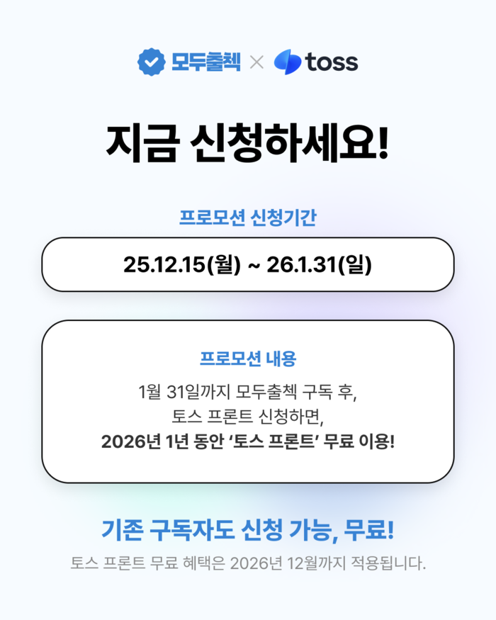 신규 고객의 경우 모두출첵 회원가입 및 구독 후 고객센터를 통해 토스 사용을 신청하면, 택배로 기기를 수령한 뒤 설치 안내를 받을 수 있다. 기존 사용자 역시 고객센터를 통해 토스 신청 시 동일한 혜택이 자동 적용된다.