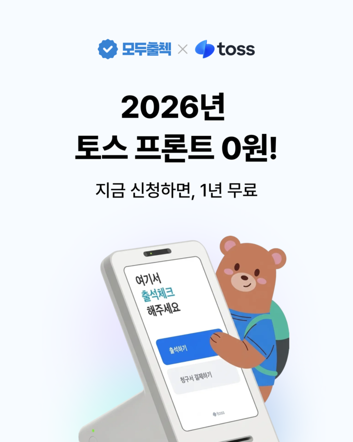 이벤트 기간 동안 모두출첵을 구독하고 토스를 사용하는 고객은, 2026년 한 해 동안 토스 기기 사용료(월 5,000원)가 전액 면제된다. 다만, 앱 구독료와 알림톡 비용은 별도다.