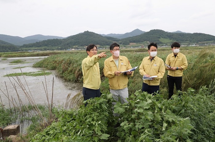 | ▲ 우승희 영암군수(왼 쪽)가 북상하고 있는 태풍 힌남두에 취약한 농경지를 찾아 관계실과 직원들에게 재난에 대한 피해 예방을 당부하고 있다. / 영암군 제공 |