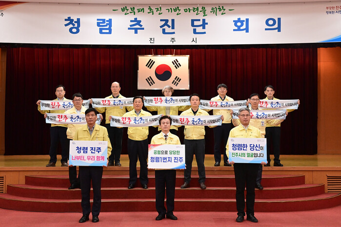 이를 위해 22일 시청 시민홀에서 조규일 진주시장과 간부공무원 40여 명이 참여한 가운데 청렴추진단 회의를 열어 △2022년 청렴도 평가의 취약 부분 분석 △2023년 반부패 청렴 향상 시책 설명 △청렴실천 결의를 진행했다.