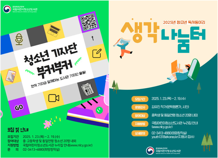 [시민일보 = 이대우 기자] 국립어린이청소년도서관(관장 박주옥)은 오는 2월 19일(수)까지 청소년 프로그램인 기자단 「부커부커」와 독서동아리 「생각나눔터」의 참가자를 모집한다.