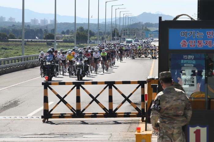 28일 경기도 파주시에서 열린 뚜르 드 디엠지(Tour de DMZ) 국제 자전거대회에서 참가자들이 통일대교를 건너 민간인통제선 안으로 진입하고 있다.