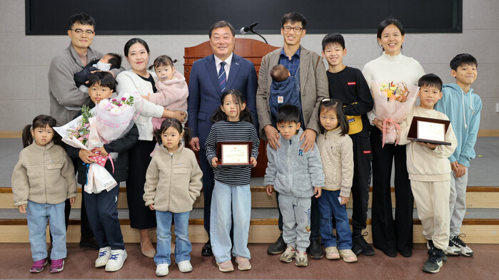 [합천=이영수 기자] 아이 한명 낳아 기르기도 힘든 현대사회 속에서도 경남 합천군은 최근 여섯째 아이를 출산한 산모가 두 명 탄생해 주위의 축하와 함께 지역사회에 새로운 활기를 불어넣고 있다. 군은 다자녀 모범 가정으로서 출산 장려 분위기 조성에 기여한 두 가정에 군수 표창을 수여했다.