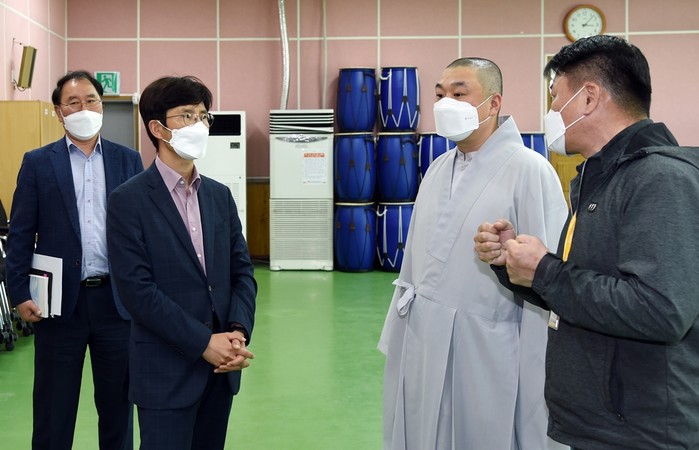 안동광 경기 의정부시 부시장은 지난 21일 일상 회복 추진에 따른 노인여가복지시설 운영 재개에 따라 송산노인종합복지관을 방문해 코로나19 방역 수칙 준수 확인 및 복지관 개관 준비·시설 현장 등을 점검했다. 사진은 안 부시장(왼쪽에서 두 번째)이 시설 관계자와 시설을 둘러보고 있는 모습.(사진제공=의정부시청)