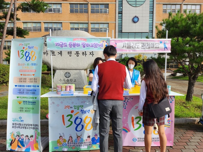 경기 포천시청소년상담복지센터는 최근 지역내 신봉초등학교, 왕방초등학교, 송우중학교, 일동고등학교, 포천일고등학교에서 새학기 아웃리치를 진행했다. 사진은 관계자가 '청소년전화 1388' 이용방법 안내를 하고 있는 모습. (사진제공=포천시청)