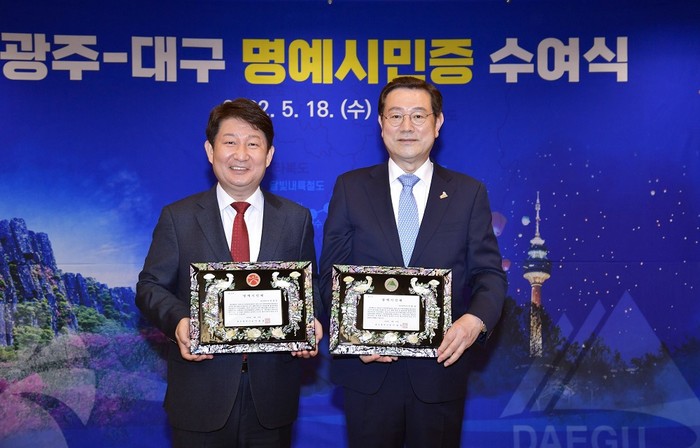 [광주=정찬남 기자] 이용섭 광주광역시장과 권영진 대구광역시장이 18일 오후 시청 비즈니스룸에서 양 도시간 시정 발전에 기여한 공로로 명예시민증을 상호 전달한 뒤 기념촬영을 하고 있다./광주광역시 제공