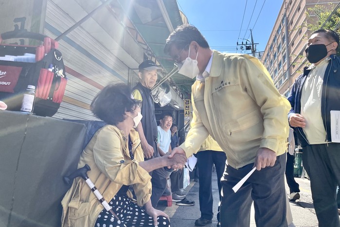 김길성 서울 중구청장이 지난 19일 오전 황학동 전기상가 화재 발생 현장을 찾아 피해 상황을 점검하고, 주민을 위로했다. 이날 김 구청장은 조속한 시일 내에 피해 복구가 이루어지도록 적극 지원하겠다고 전했다. 사진은 화재 발생 현장을 찾은 김 구청장(가운데)이 주민을 위로하고 있는 모습. (사진제공=중구청)