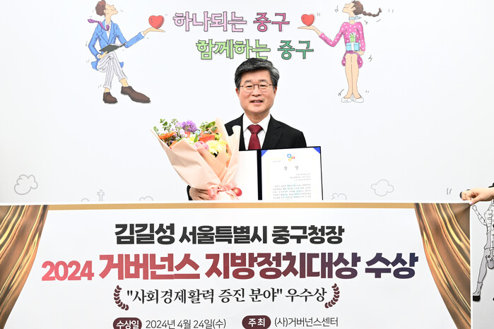 [시민일보 = 여영준 기자] 김길성 서울 중구청장이 지난 24일 ‘2024 거버넌스지방정치대상’ 사회경제 활력 증진분야에서 우수상을 받았다.