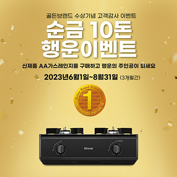 린나이가 한국산업의 브랜드파워(이하 ‘K-BPI’) ‘골든 브랜드’ 수상을 기념하여 고객감사 이벤트를 진행한다.