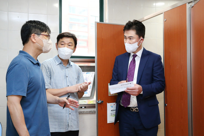 오언석 서울 도봉구청장은 최근 서울시의원들과 함께 지역내 가인초등학교, 누원초등학교, 신방학중학교를 방문해 학부모들로부터 학교시설 등에 대한 의견을 청취하고, 현장을 점검했다. 사진은 오 구청장(오른쪽)이 가인초등학교 시설을 살피고 있는 모습.(사진제공=도봉구청)