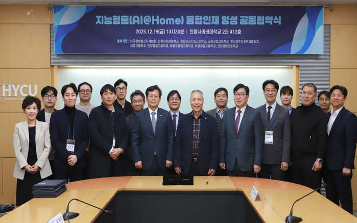 한양사이버대학교(총장 이기정)는 2025년 12월 19일(금) 13시 30분, 한양사이버대학교 2관 413호에서 한국정보통신자격협회 및 전국 특성화 고등학교와 함께 ‘지능형홈(AI@Home) 미래형 융합인재 양성을 위한 상호협력 협약식’을 개최하였다.