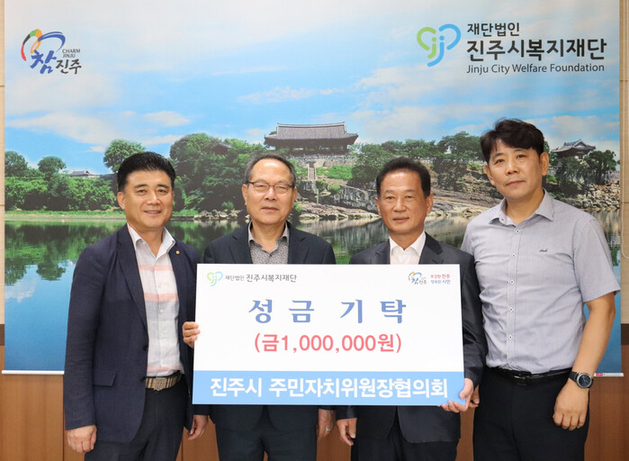 진주시 주민자치위원장협의회(회장 강승중)는 최근 집중호우로 피해를 입은 진주지역 주민들을 돕기 위해 진주시복지재단(이사장 이성갑)에 성금 100만 원을 기탁했다.