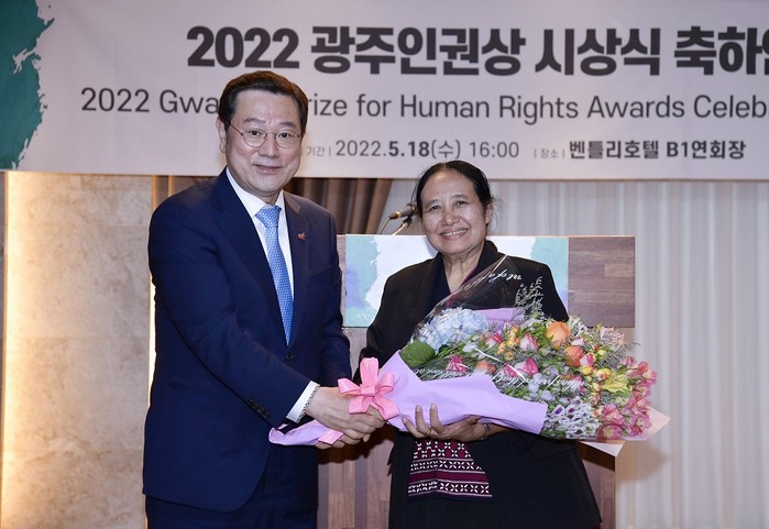 [광주=정찬남 기자] 이용섭 광주광역시장이 18일 오후 동구 벤틀리호텔에서 열린 '2022 광주인권상 시상식 축하연회'에 참석해 인권상 수상자 미얀마 출신 인권운동가 신시아 마웅(Cynthia Maung)에게 꽃다발을 전달하고 있다./광주광역시 제공