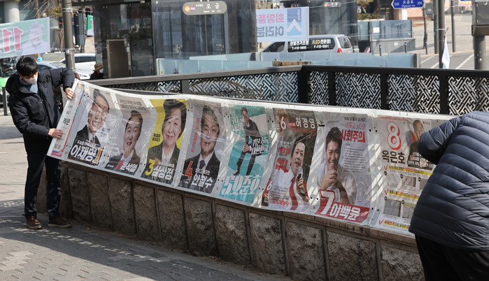 제20대 대통령선거 이튿날인 10일 서울 송파구 오금역 인근에서 가락본동 주민센터 관계자들이 대선 벽보를 철거하고 있다.