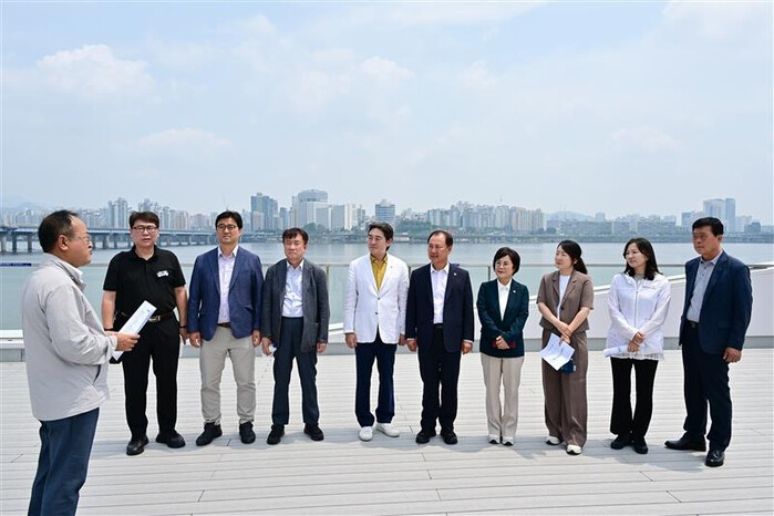 서울시의회 교통위원회가 최근 미래한강본부가 추진중인 한강버스와 여의도 선착장을 방문하고 진행상황 및 안전사항 등에 대한 점검을 실시했다. 사진은 선착장을 방문한 의원들이 현장 관계자의 설명을 듣고 있는 모습. (사진=서울시의회 제공)