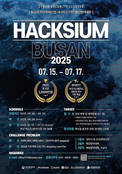 정나영 시 미래기술전략국장은 “올해 처음으로 개최되는 「2025 HACKSIUM 부산」을 통해 동남권 지역특화산업 분야의 보안 취약 시나리오를 확인하고, 이에 능동적으로 대응할 수 있는 실전형 화이트해커를 양성할 수 있는 좋은 계기가 되길 바란다”라며, “앞으로도 지속적인 지원을 통해 더욱 큰 규모의 해킹방어대회를 부산에서 개최할 수 있도록 노력하겠다”라고 전했다.
