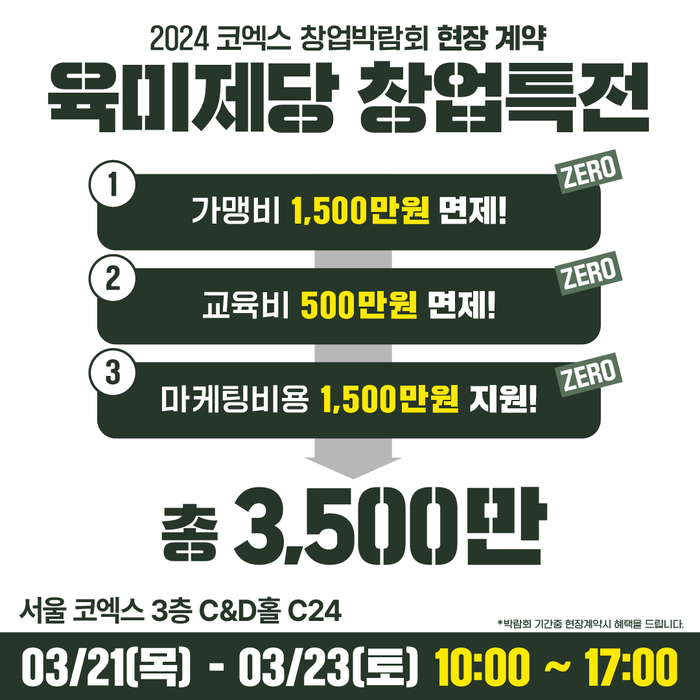 관계자는 “현장계약 한정 특전뿐만 아니라 일 평균 50건 이상의 가맹문의가 들어오고 4개월 만에 60호점을 달성할 정도로 많은 관심을 받고 있는데 이에 보답하고자 본사 차원에서 점포개발 지원 및 최대 5억원 창업대출도 지원해 드리고 있다”라며 “3일간 진행되는 IFS 프랜차이즈 창업박람회 C홀 C24부스 육미제당 부스에 방문하시어 한정 특전을 꼭 받아 가시길 바란다”라고 덧붙였다.