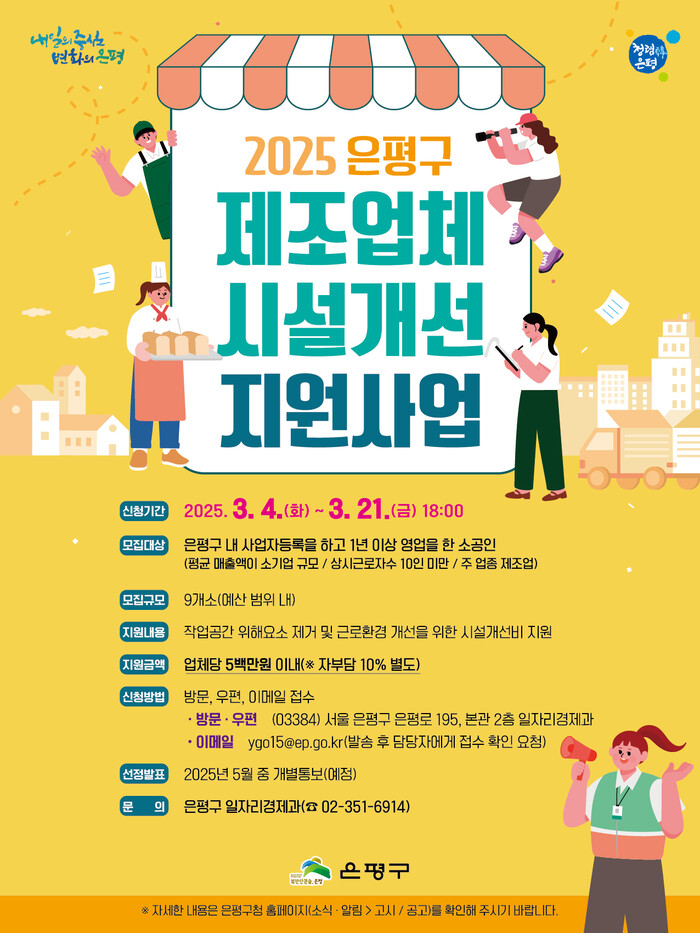[시민일보 = 이대우 기자] 은평구(구청장 김미경)는 4일부터 오는 21일까지 ‘제조업체 시설개선 지원사업’에 참여할 업체를 모집한다고 밝혔다.