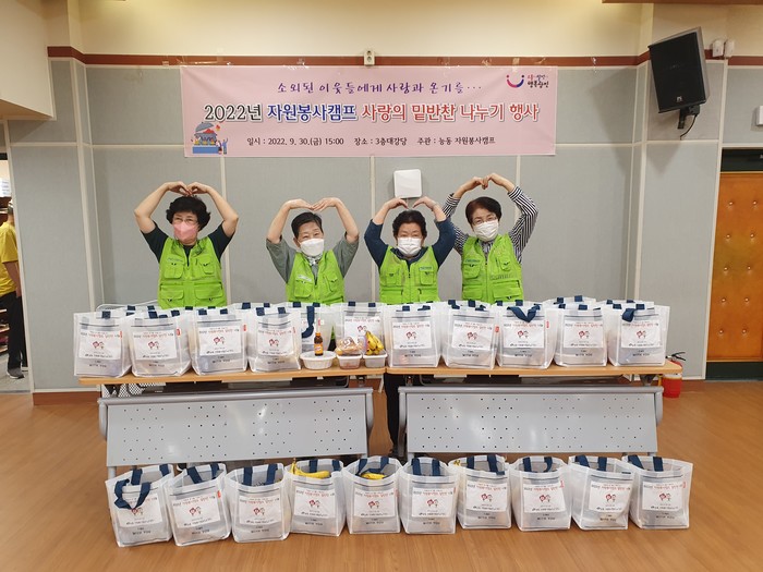 서울 광진구 능동은 최근 자원봉사캠프 주관으로 사랑의 밑반찬 나눔 행사를 진행했다. 자원봉사캠프 회원들은 홀몸노인과 한부모가정 30가구를 대상으로 겉절이김치, 돼지고기 주물럭등을 각 가구에 3통씩 전달했다. 사진은 참여자들이 기념촬영을 하는 모습. (사진제공=광진구청)