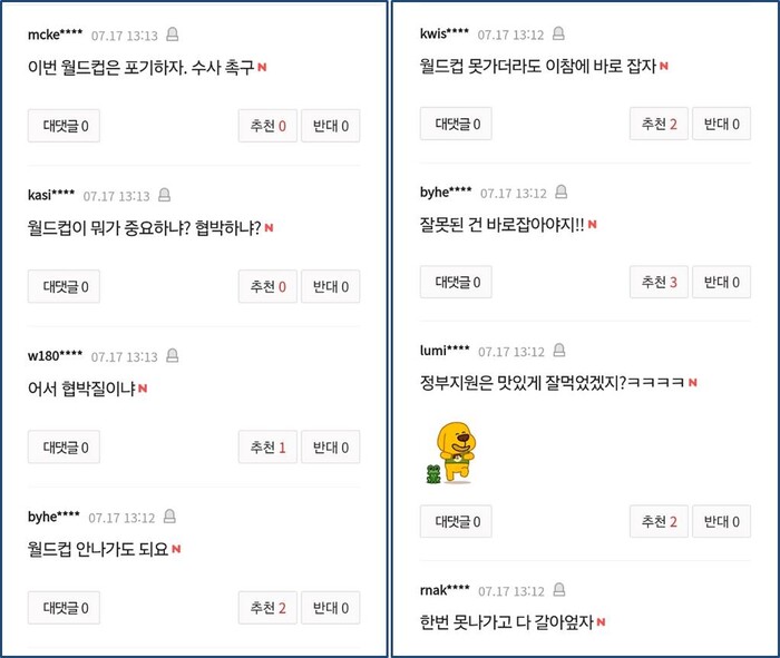 한편, 네티즌들은 "월드컵 못가더라도 이참에 바로잡자", "정부지원은 맛있게 잘먹었겠지??", "월드컵이 뭐가 중요하냐? 협박하냐??", "한번 못나가고 다 갈아엎자" 등의 댓글을 쏟아내며 뜨거운 반응을 보이고 있다.